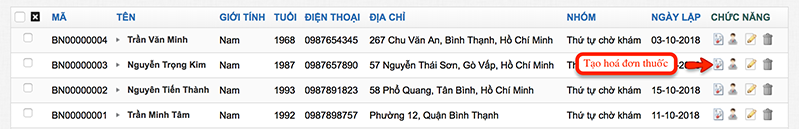 Chọn chức năng tạo hóa đơn thuốc cho một bệnh nhân